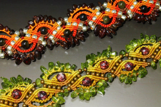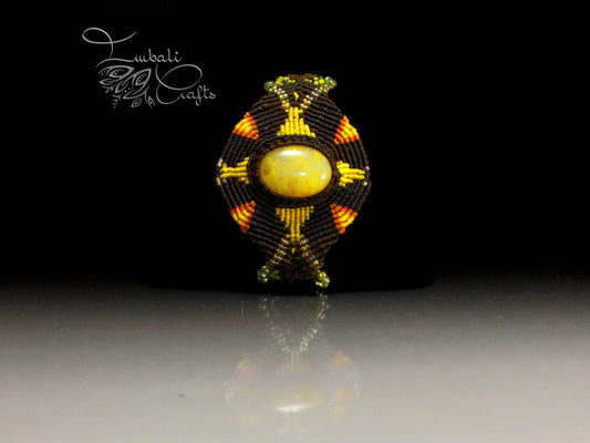 brown & yellow aztec macrame cuff bracelet with quartz and toho seed beads