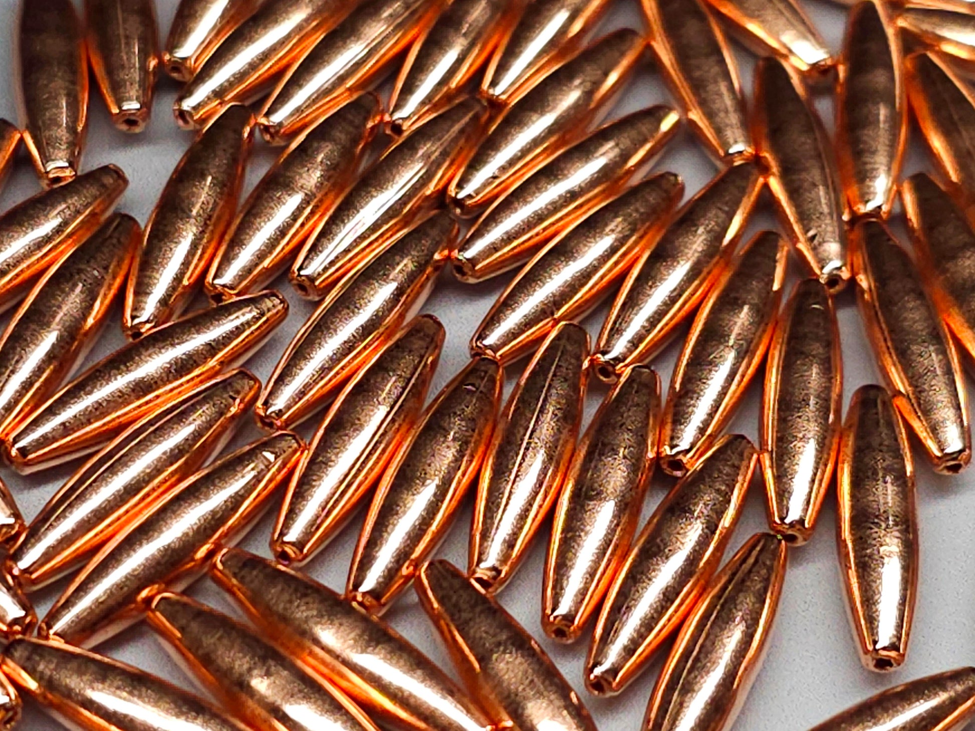 These are genuine, hollow, bare copper beads. Great quality with a perfectly eliptical with a smooth finish. These beads work beautifully for a variety of crafts like wire work, micro-macrame or just as beautiful spacers for bead jewellery.